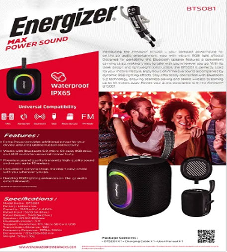 اسپیکر کوچک بلوتوثی Energizer (انرجایزر) مدل BST081 یکی از محبوب ترین های بازار برای اسپیکرهای کوچک و جم و جور و مسافرتی می باشد . اسپیکر کوچک بلوتوثی انرجایزر با برق شهری قابل شارژ است و شامل باتری می باشد . بی سیم است و از طریق بلوتوث به موبایل لپ تاپ و تب لت و ... قابل اتصال است و در پیک نیک و منزل و محیط کار به راحتی می توان حمل نمود وزن حدود 515 گرم دارد و سبک است و ببه راحتی می توان از موسیقی مورد علاقه خود بهره مند شد. روش دیگری برای انتخاب موسیقی بجز بلوتوث دارد و از طریق جایگاه کارت حافظه اسپیکر کوچک و کم جای انرجایزر می توانید اهنگ های مورد علاقه خود را ذخیره نمایید و از طریق کارت حافظه از اسپیکر انرجایزر BST081 استفاده کنید .